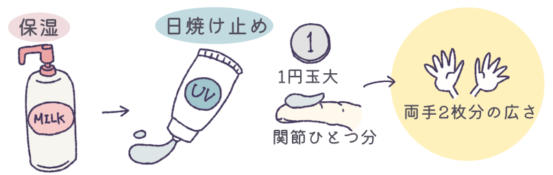 ローションなら1円玉サイズを大人の手のひら2枚分の広さに塗ります